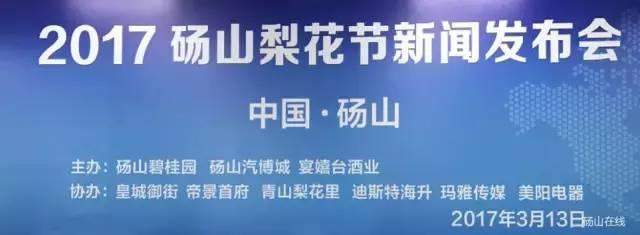 2017年砀山梨花节时间为3月16日-4月16日,本届梨花节由砀山碧桂园、砀山汽博城和宴嬉台酒业集团联合主办!皇城御街、帝景首府、青山梨花里、迪斯特海升、玛雅传媒、美阳电器共同协办。